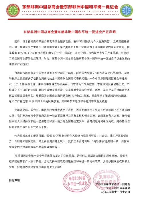 东部非洲中国总商会暨东部非洲中国和平统一促进会严正声明 2025-11-17