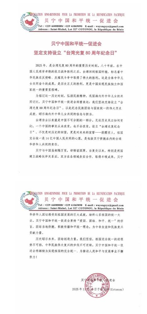 贝宁中国和平统一促进会发表声明坚定支持设立台湾光复80周年纪念日 2025-11-17