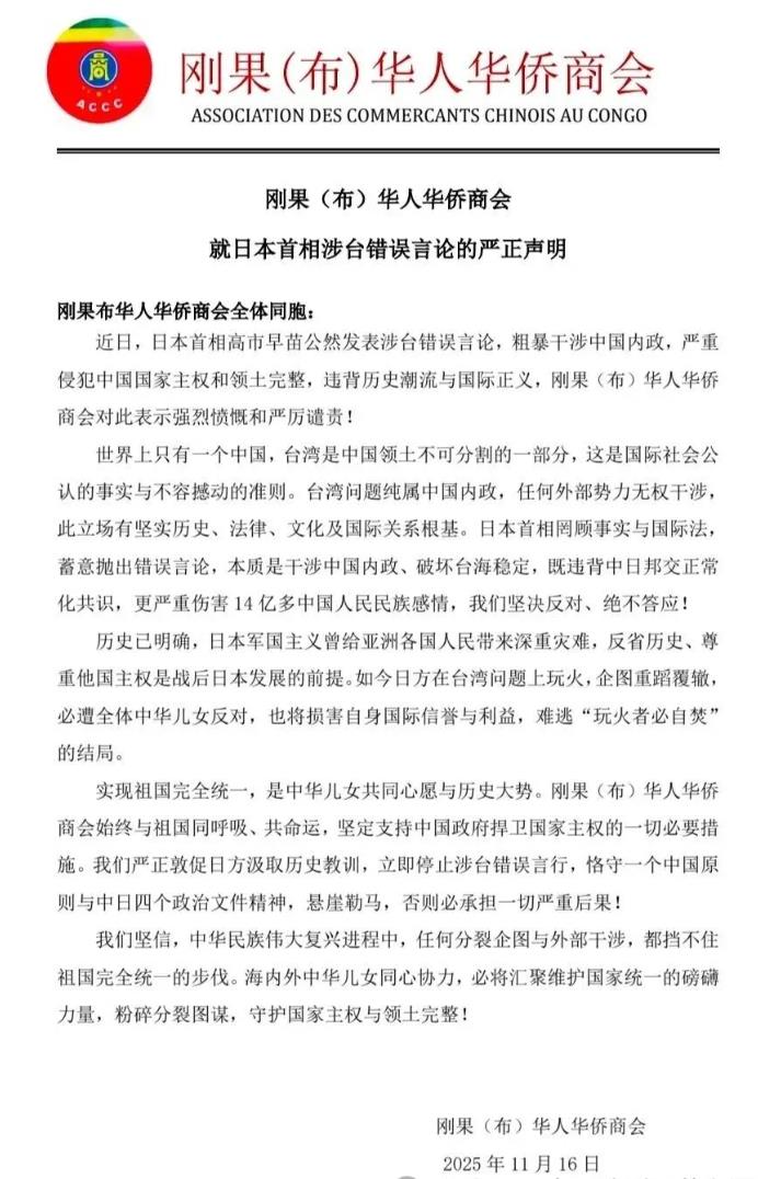 刚果(布)侨界就日本首相涉台错误言论发表严正声明 2025-11-19