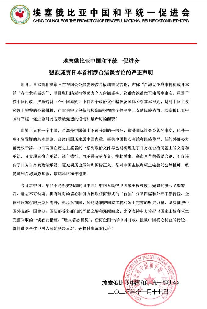 埃塞俄比亚中国和平统一促进会强烈谴责日本首相涉台错误言论的严正声明 2025-11-19