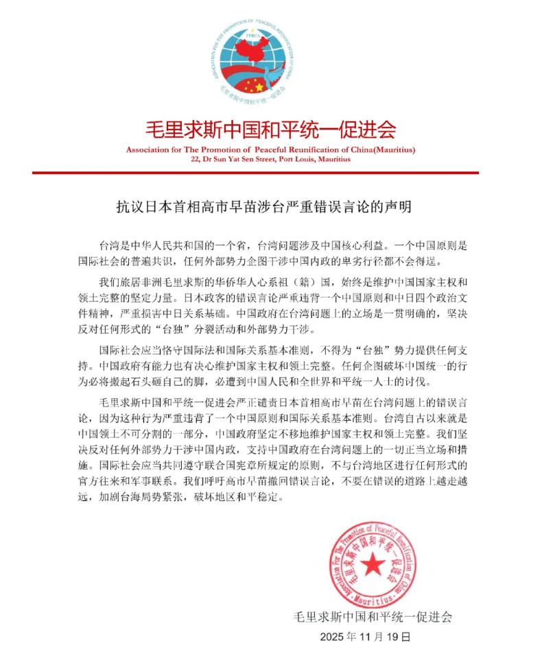 毛里求斯侨界发表声明谴责日本首相涉台错误言论 2025-11-26