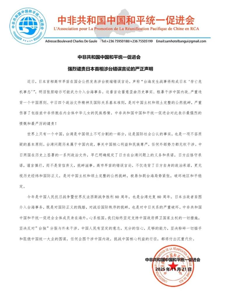 中非共和国中国和平统一促进会强烈谴责日本首相涉台错误言论 2025-11-26