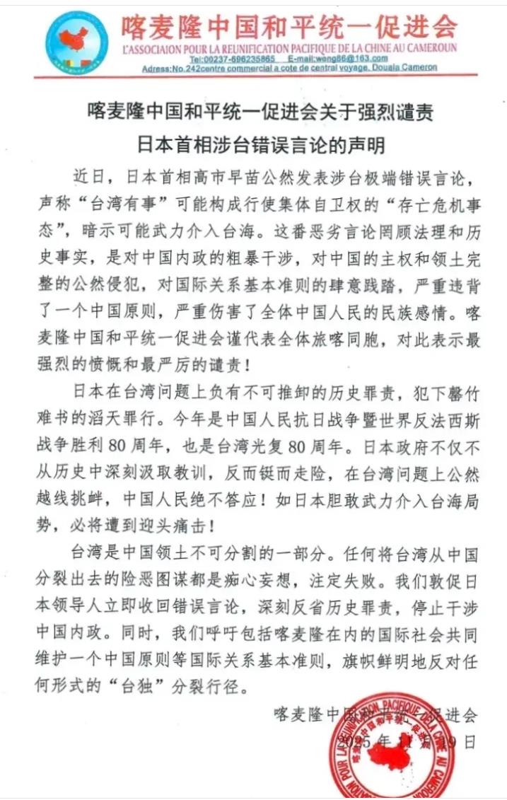 喀麦隆侨界强烈谴责日本首相高市早苗涉台错误言论 2025-11-26