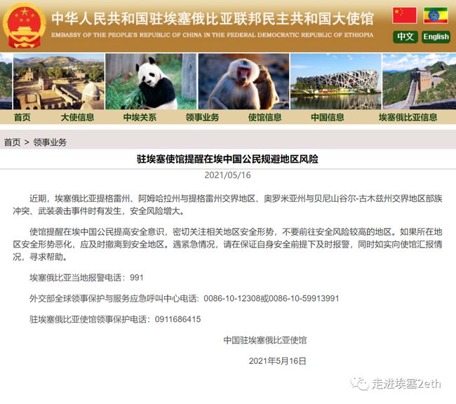 安全提醒:中使馆敦促在埃塞俄比亚中国公民规避地区风险 2021-05-18